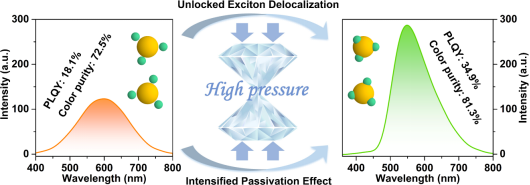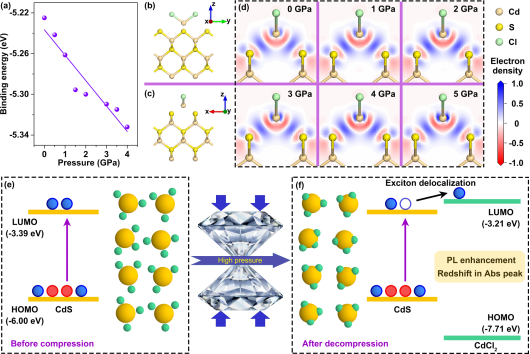 固态照明技术凭借其极高的光电转换效率和长寿命等优势,成为推动绿色低碳照明发展的关键力量。当前,开发新型半导体材料是实现更高能源利用率、推进可持续发展的重要途径。在众多材料中,量子点因其高发光效率、低生产成本和广色域覆盖能力,正逐步取代传统LED,占据市场主流。由于尺寸微小,量子点具有高比表面积,导致其物理化学性质强烈依赖于表面态的调控。通常情况下,表面原子因配位不饱和而形成大量悬挂键,进而显著降低量子点器件的性能。压强作为一种独立于温度和组分的热力学参量,能够有效缩短原子间距、调控材料的电子结构,为物质科学研究提供了新的维度和手段。在前期研究中,邹勃教授团队肖冠军课题组通过对CdSe量子点施加压力,有效增强了配体对表面无辐射缺陷的钝化作用,使其荧光强度提升了一个数量级以上(J. Am. Chem. Soc. 2018, 140, 13970−13975)。2024年,该团队进一步利用不同类型配体对CdS进行表面钝化,在高压下实现了其本征发光与缺陷发光的选择性增强,并最终获得白光发射,也为通过高压研究指导常压合成,进而服务常压科学奠定基础(CCS Chem. 2025, 7, 160–169)。2025年,该课题组系统研究了高压下不同配体包覆量对CdS光学性能的影响,在同一材料与选择性配体复合体系中,分别实现了从橙光到白光以及从橙光到蓝紫光的两类压致变色调控(Laser Photonics Rev. 2025, 19, 2401971)。