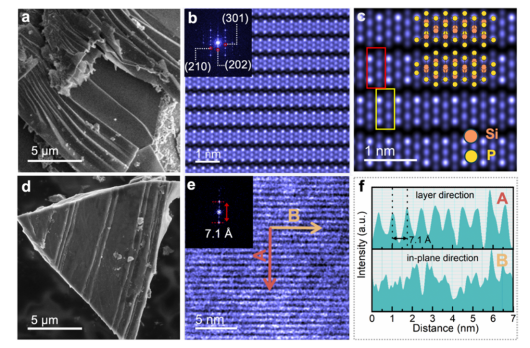 图1. SiP2晶体(a-c)及其卸压样品(d-f)的形貌及原子分辨结构分析。常压截获的OSAL-SiP2展现出层间堆垛方向有序、层内原子排列无序的结构特征,并具有与晶体样品相似的层状形貌。