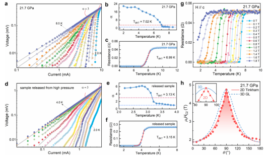 图2. OSAL SiP2的二维超导电性。高压样品及常压截获样品均呈现典型的Berezinskii-Kosterlitz-Thouless转变及显著的各向异性上临界磁场特征,其角度依赖的上临界磁场拟合结果与二维Tinkham模型一致。