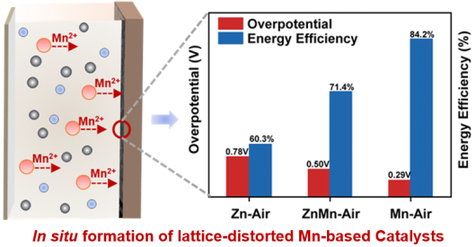 新型电池物理与技术教育部重点实验室杜菲、姜珩教授团队与合作者在水系金属空气电池研究方面取得重要进展,相关成果以” In situ formation of lattice-distorted Mn-based catalysts boosting high energy-efficiency aqueous metal-air batteries”为题发表在《Advanced Materials》上。