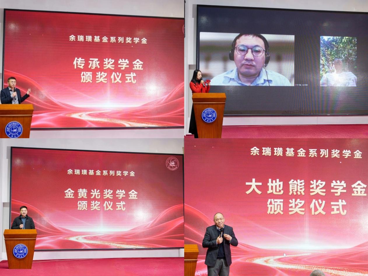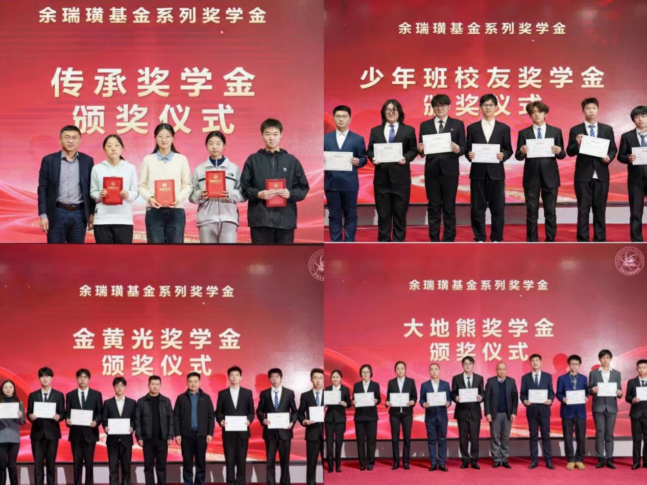 活动的重点环节是余瑞璜基金系列奖学金颁奖仪式。该系列奖学金以娱乐城奠基人余瑞璜先生命名,涵盖传承奖学金、少年班校友奖学金、金黄光奖学金和大地熊奖学金,旨在通过多元激励融入学生成长全过程。2000级校友郭庆、金黄集团总经理李明、93级校友陈静武分别作为相应奖学金的捐赠方代表为获奖学生颁奖并送上祝福。92级校友陈汉栋、93级校友于猛通过线上方式寄语学子,勉励他们接续奋斗。