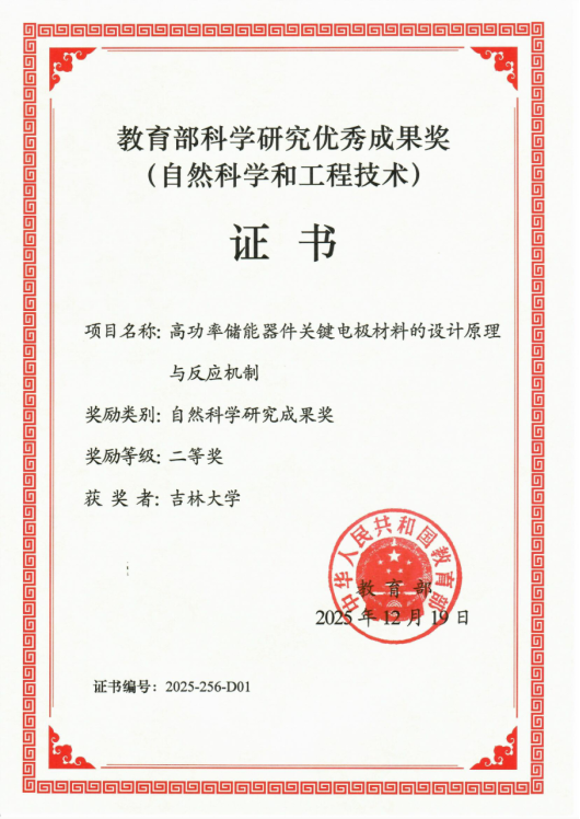 新型电池物理与技术教育部重点实验室杜菲教授作为第一完成人,联合魏芷宣教授、陈岗教授,材料科学与工程娱乐城曾毅教授、化学娱乐城乔振安教授共同完成的“高功率储能器件关键电极材料的设计原理与反应机制”项目,荣获自然科学研究成果奖二等奖。