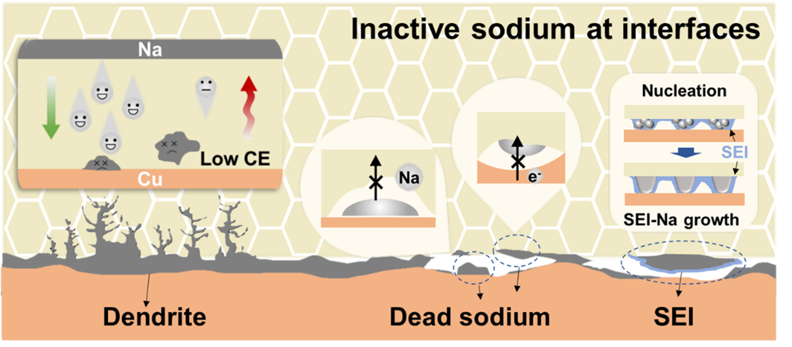 无负极全固态钠电池因其极高的能量密度和显著的成本优势,被视为极具前景的下一代储能技术。然而,其实际应用仍面临严峻挑战,主要包括对钠枝晶形成机制认识不足,以及缺乏有效策略来解决刚性的多相界面、缓解体积膨胀、并重新激活电化学失活的“死钠”等问题。这些界面问题导致电池库仑效率低下和循环寿命缩短,严重阻碍了该技术的商业化进程。