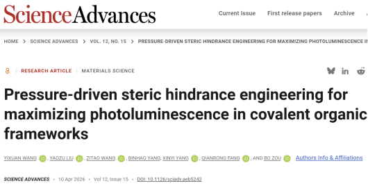 Sci. Adv.| 杨新一教授等人利用高压驱动空间位阻工程实现共价有机框架材料的荧光增强与截获